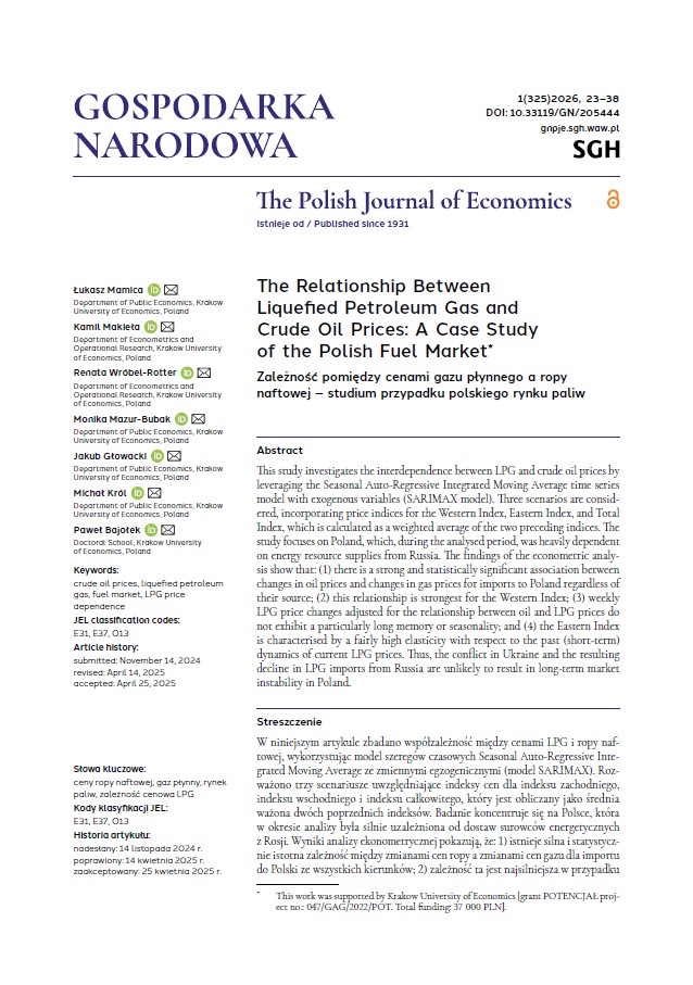 W niniejszym artykule zbadano współzależność między cenami LPG i ropy naftowej, wykorzystując model szeregów czasowych Seasonal Auto-Regressive Integrated Moving Average ze zmiennymi egzogenicznymi (model SARIMAX). Rozważono trzy scenariusze uwzględniające indeksy cen dla indeksu zachodniego, indeksu wschodniego i indeksu całkowitego, który jest obliczany jako średnia ważona dwóch poprzednich indeksów. Badanie koncentruje się na Polsce, która w okresie analizy była silnie uzależniona od dostaw surowców energetycznych z Rosji. Wyniki analizy ekonometrycznej pokazują, że: 1) istnieje silna i statystycznie istotna zależność między zmianami cen ropy a zmianami cen gazu dla importu do Polski ze wszystkich kierunków; 2) zależność ta jest najsilniejsza w przypadku indeksu zachodniego; 3) tygodniowe zmiany cen LPG skorygowane o związek między cenami ropy naftowej a cenami LPG nie wykazują szczególnie długiej pamięci ani sezonowości; 4) indeks wschodni charakteryzuje się dość dużą elastycznością względem przeszłej (krótkookresowej) dynamiki aktualnych cen LPG. Tak więc konflikt na Ukrainie i wynikający z niego spadek importu LPG z Rosji prawdopodobnie nie spowodują długoterminowej niestabilności rynku w Polsce. Do treści artykułu można przejść klikając w ikonę artykułu.